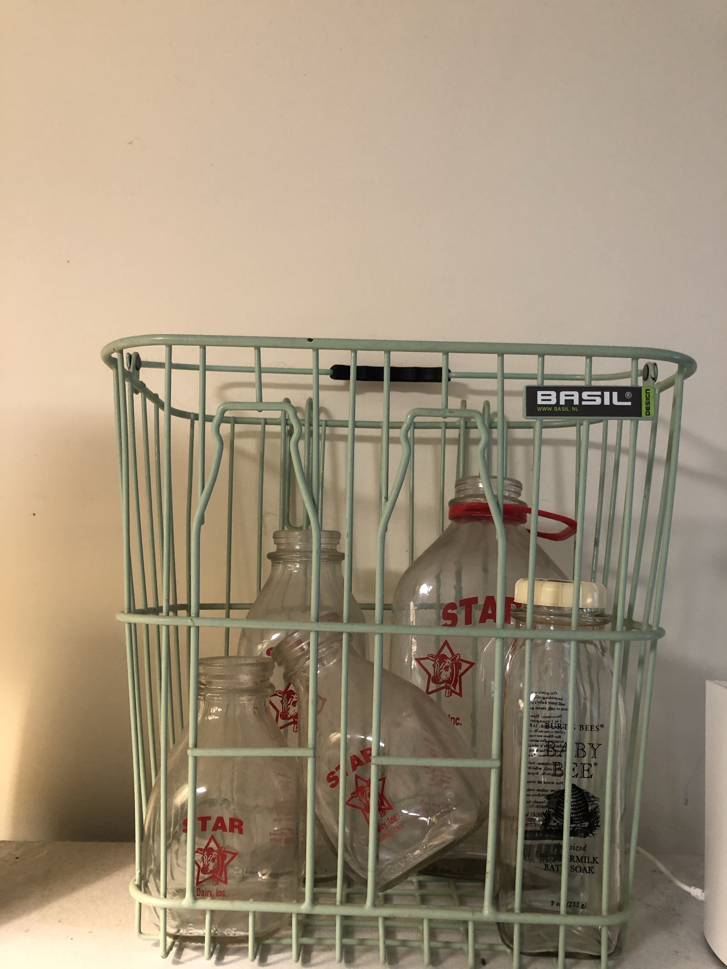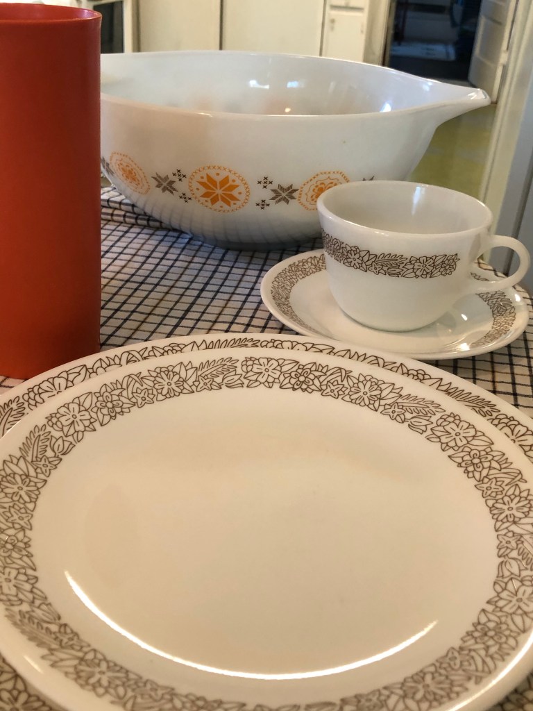 I found all of our 70s kitchen stuff including Tupperware glasses, our set of Woodland Brown Corelle dishes that my husband grew up with (they are our every day dishes) and a Pyrex Town & Country Cinderella bowl for the brownies.