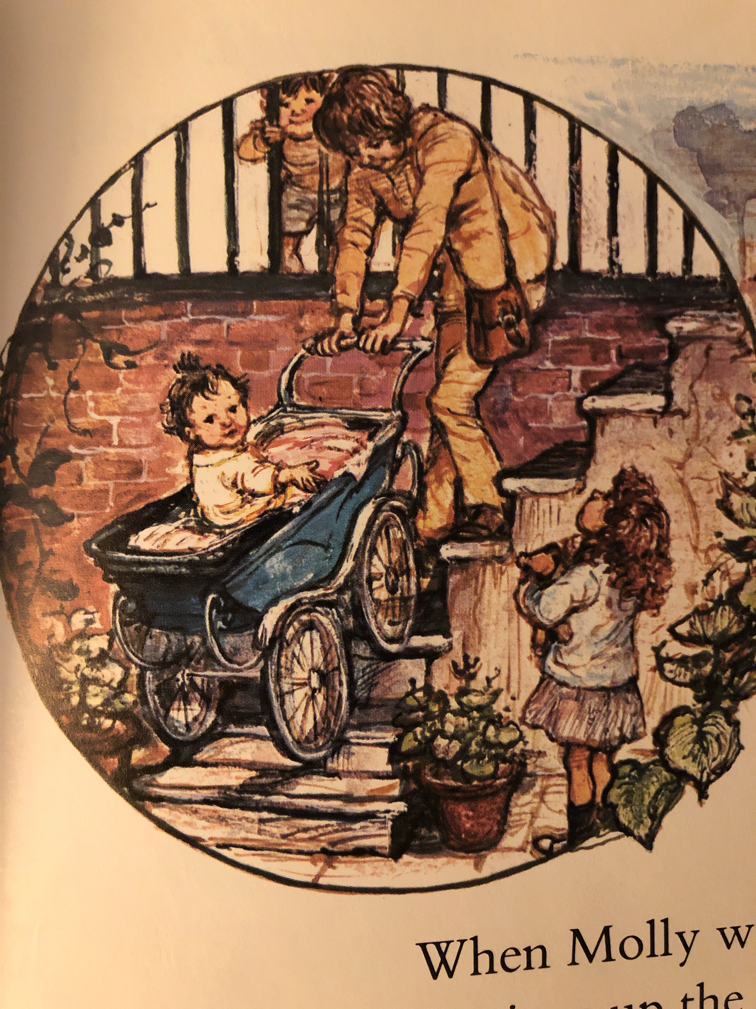 I found Shirley Hughes where I have found treasure all my life- in a library. I had an assignment for a child development class in high school and had to review 2 books. I saw these both and kept them checked out for the rest of the year. “Moving Molly” and “Dogger” are still my favorites.