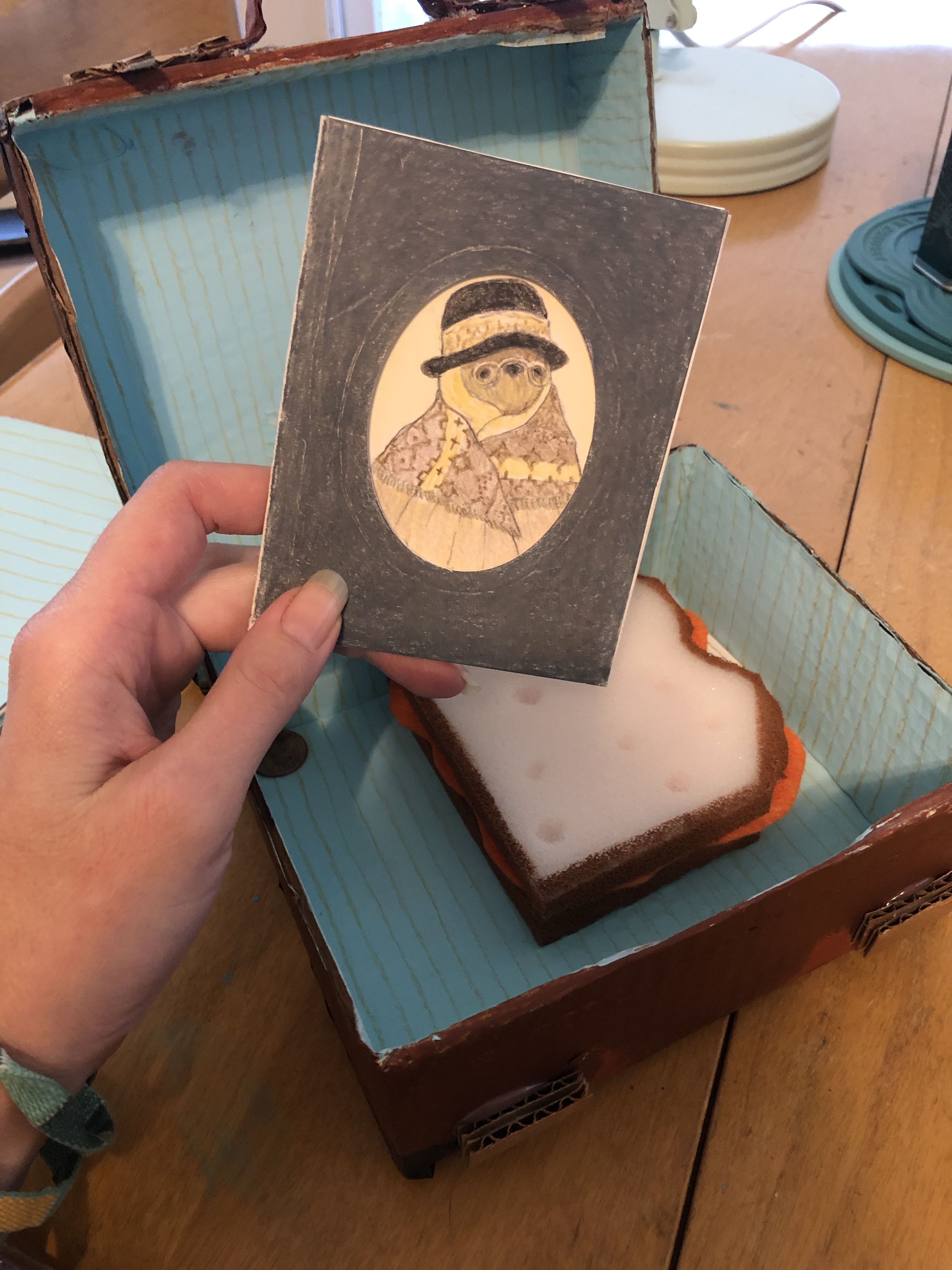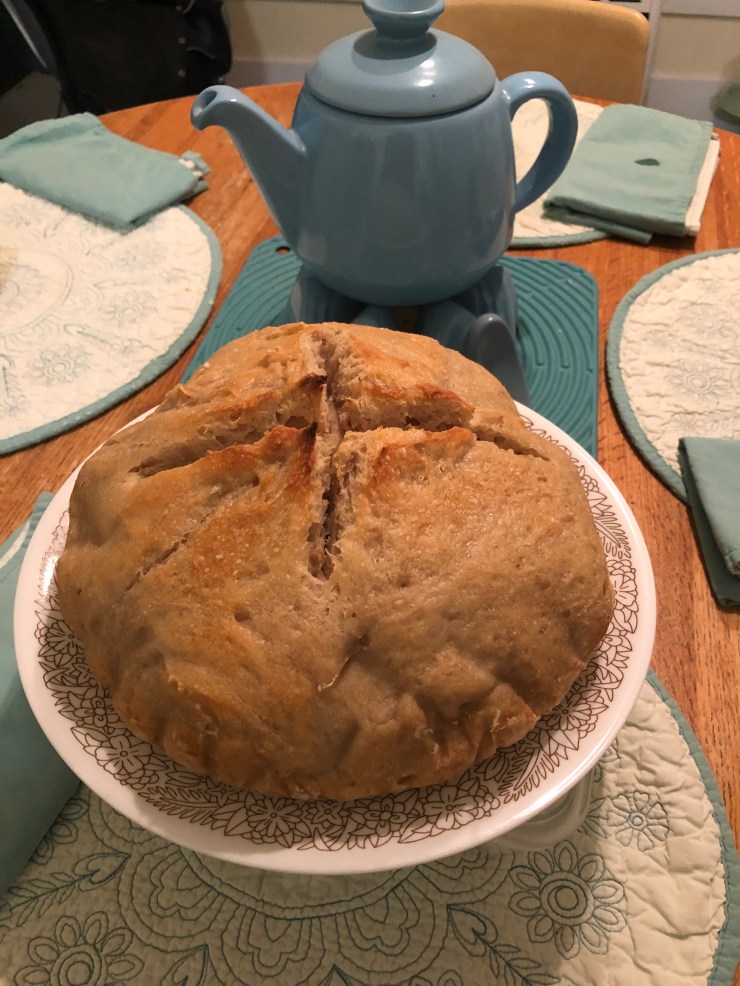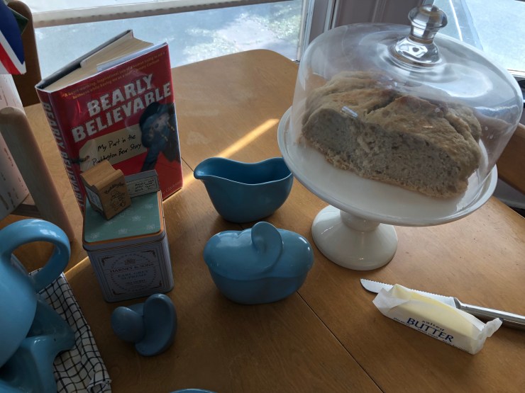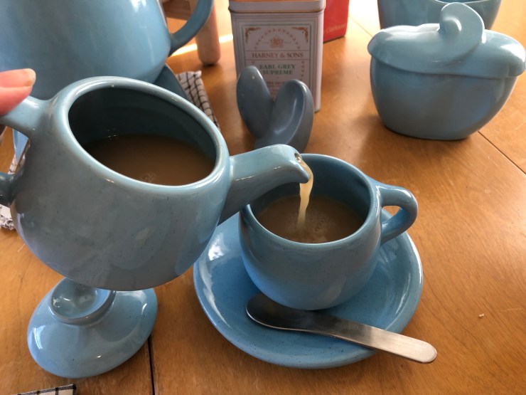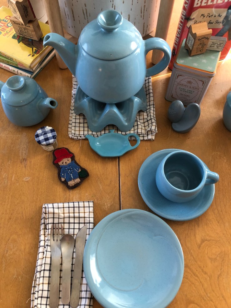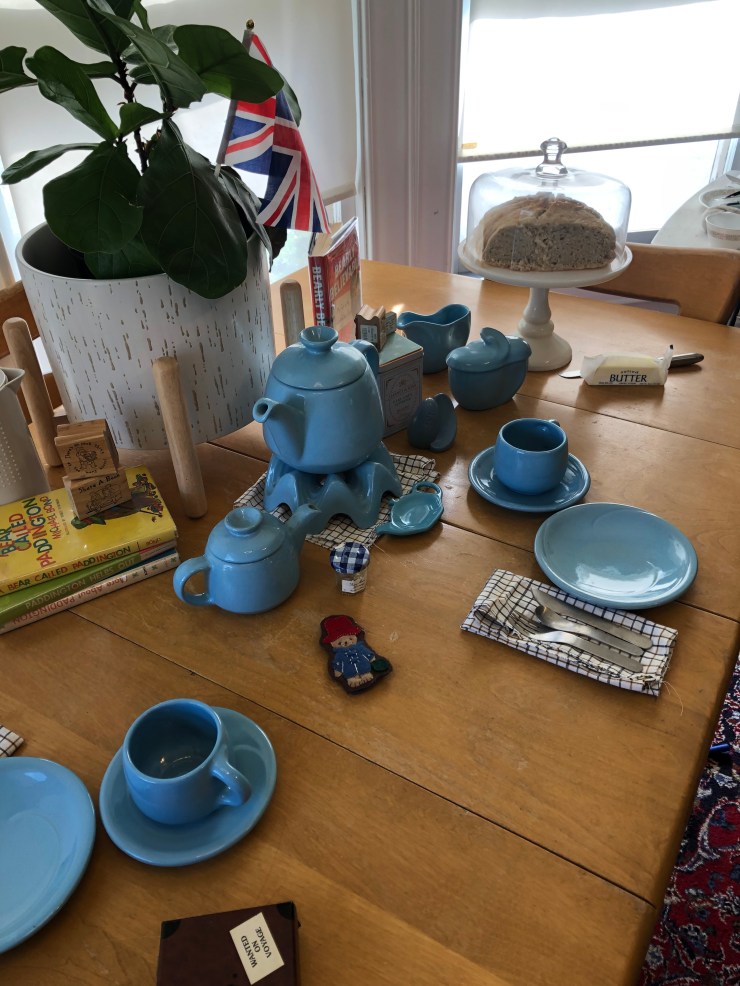 Then, I got to work setting it all up! I had a hankering for bread that day so I had bead and butter for tea instead of store-bought stuff. It was so fun to set up the table in my studio. I brought up my Robin’s Egg Blue Frankoma tea service. This started out as two cups and a tray that was left to me by a wonderful Pre-K teacher who helped me so much in my early career. I added to it over the years, always keeping it in my classroom until I became an art teacher. At that point I was too busy and messy to enjoy this set in that environment so I brought it home and it lives happily now in my kitchen hutch. Maybe one day I’ll take it back, but I do enjoy it more now.