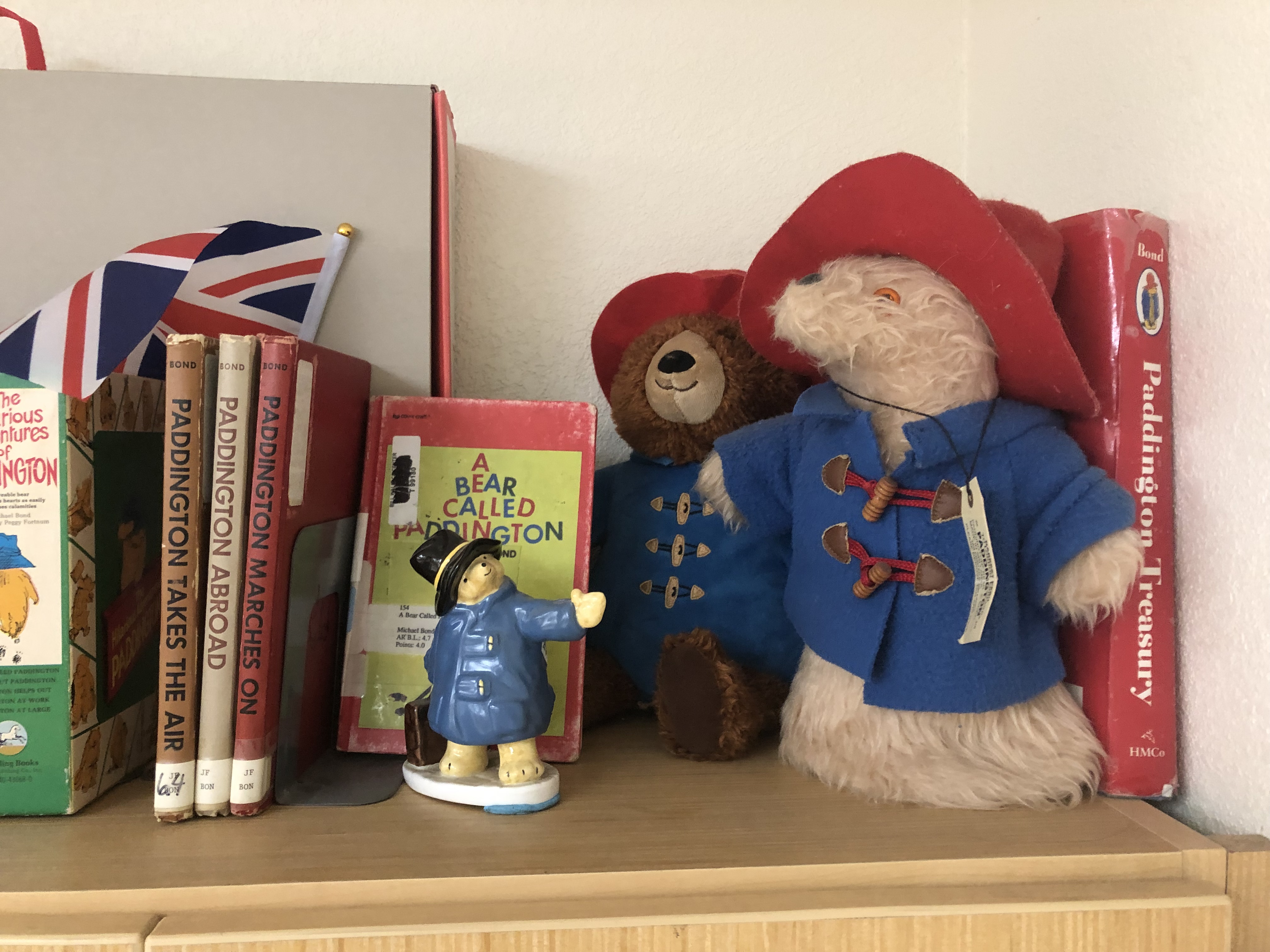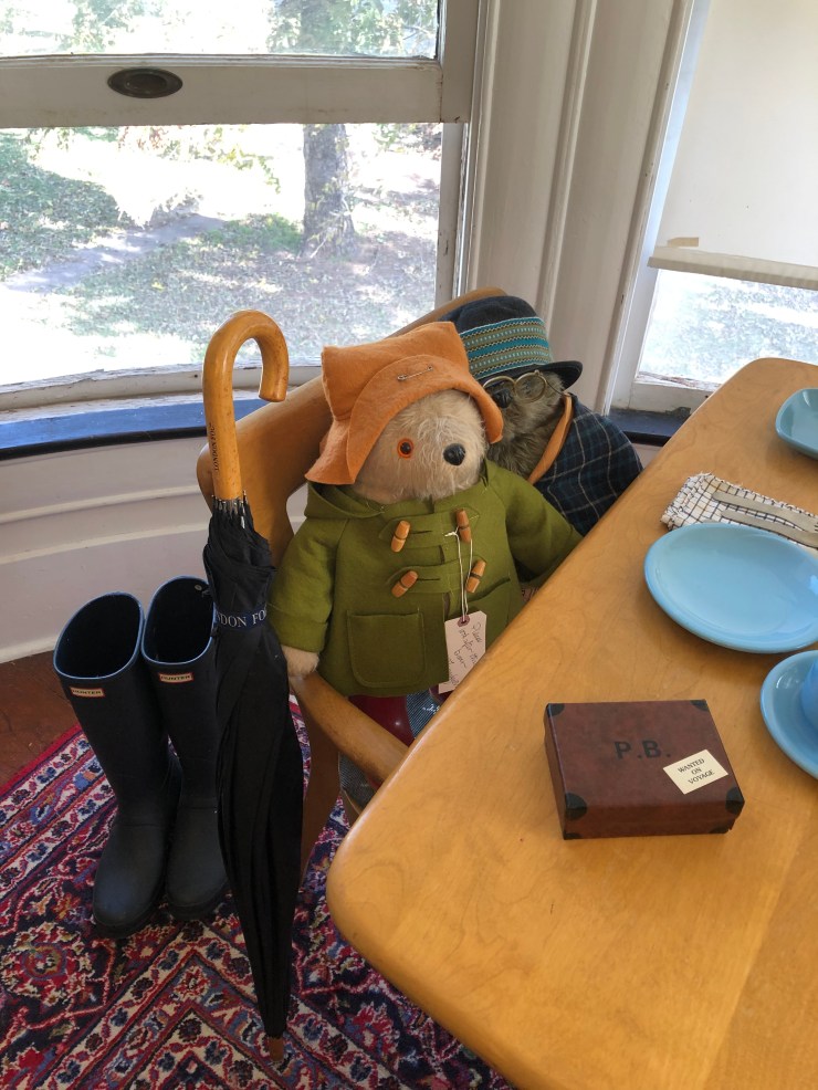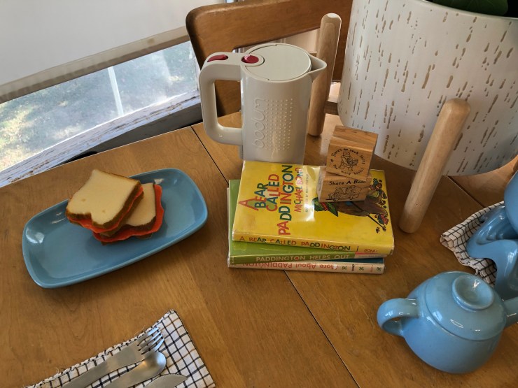 My Paddington guests were Paddington and his Aunt Lucy, both by the lovely English company Gabrielle Designs. The suitcase is also by them, and I based my classroom suitcase on its design. The books on the table are the first three Paddington books by Michael Bond. My first graders always got to hear the first two as I read them to them. Now I read the picture book made of the first two chapters to my little ones.