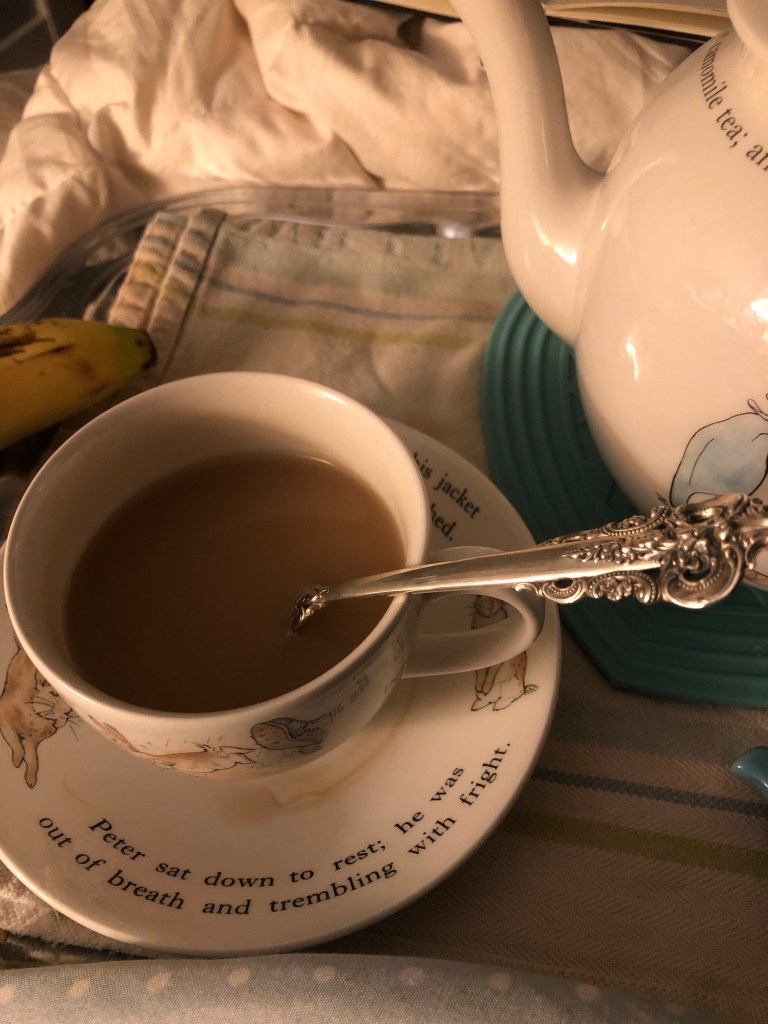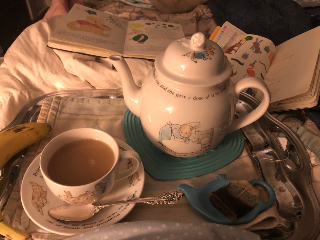 I load up the tea tray with breakfast for me and the kids. (They like to wake up the same way I do.) Then I get back in bed. On my bedside table is a nursery lamp giving off a cozy glow. My art bag is next to me, my tea tray on my lap, my phone is softly playing a podcast. I pour tea and add honey, my spoon tinkling lightly against the porcelain cup. I sip and feel its warmth spread through my tummy.