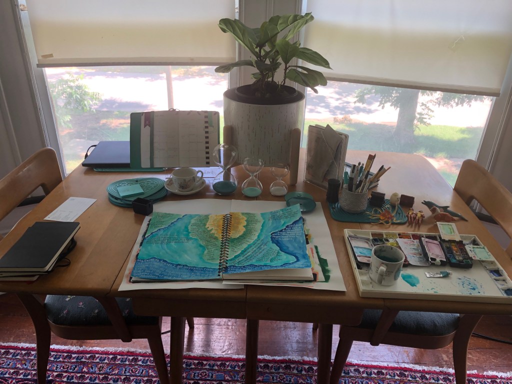 I am usually up early. I’m not an early bird so its hard but I love being awake and doing some art while the house is still and sleeping. Then I go through my flylady routines, which run like clockwork at this point and I’m so thankful. They allow my day to start stress-free. (The key is really my evening routine setting me up for success in the am.) Then its off to school where I teach art all day which is super messy and fun snd exhausting! I get my 10,000 steps by 3:00! I skip breakfast (weight management is more challenging as I get older) but have lunch at school and then tea when I get home. I rest and recoup so I can make dinner with my hubby and eat with our kids if they aren’t working or at a school event. Then hubs and I walk our dog (if the weather is good) and have time to talk to each other. I exercise. (Since I have an undiagnosed form of arthritis I find being very active really helps to alleviate my pain.) Then I do my evening routine which is absolutely key and read until I fall asleep which doesn’t take long!