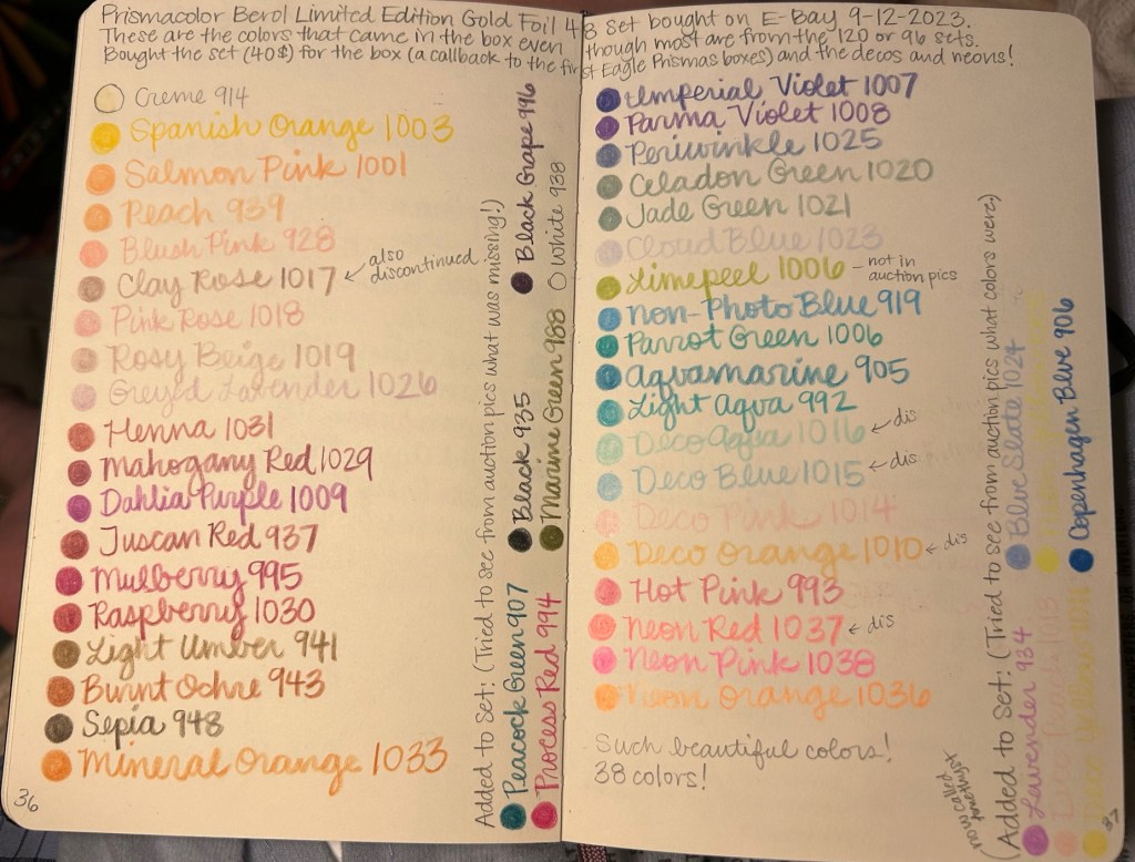 I’ve been very blessed the last few years to be able to find and afford extras and replacements for the original discontinued colors, and find a few surprises along the way. Including new Spanish Prismacolor “Juniors” I found on Amazon with decos (pastels), neons, and metallics! I haven’t tried any of these, but I want to!
