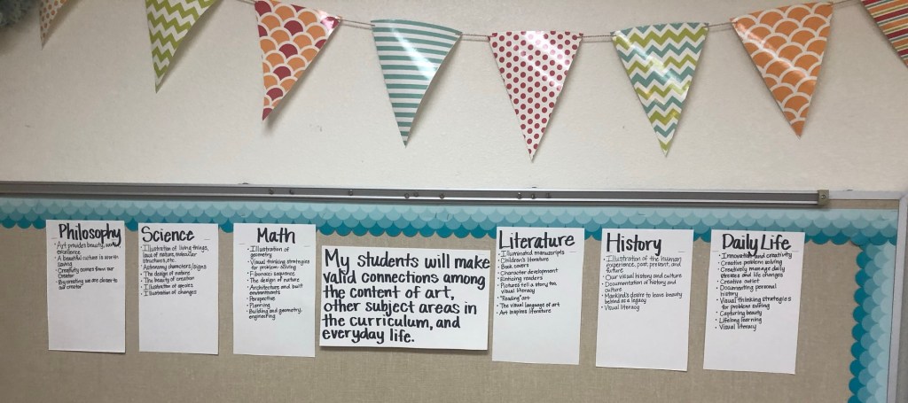 -Making connections with art and other subjects. In my art room we always had an over-arching curriculum that did this. One year we traveled around the world making art inspired by different places and cultures. One year we made art about animals all over the world. One year we made art focusing on the elements of art and principles of design. Last year we made art focusing on art history through the ages. It’s all quality education and all very meaningful! The connections they made spilled over into many other academic areas and I saw huge leaps in reading and math because of art!