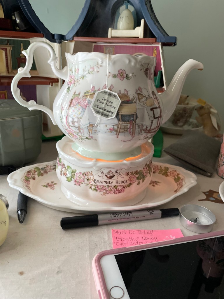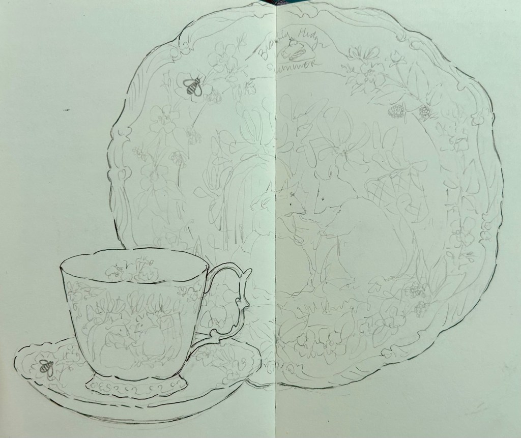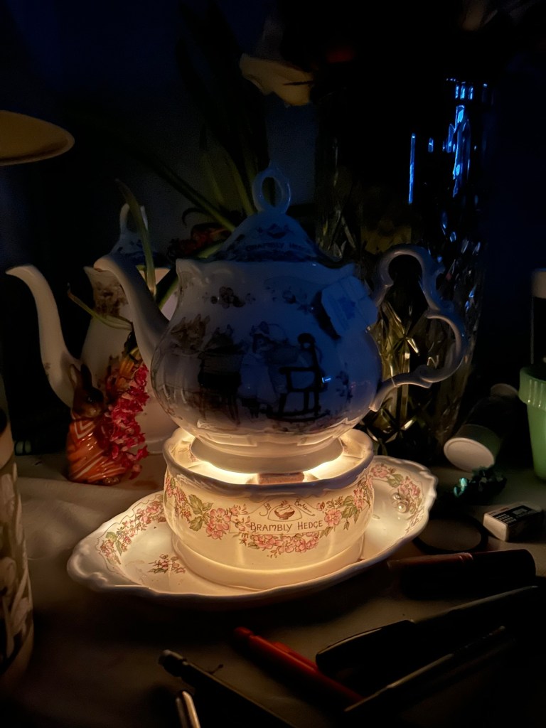 I’m holding a lot of hot cups of tea this time of the year. When I come in the bedroom with the teapot for my lovely soft start in the mornings I light the little tea candle in the teapot warmer and sit the teapot on top. The bone china glows beautifully, giving off a soft light in the winter darkness. There is something about fire in our human DNA that just makes us feel better when we see it in cold weather times; warming our minds and bodies. I sit in bed, reading, drawing, or writing and drink my tea before my busy day starts. I cannot imagine a better way to wake up, especially as I am the first up, and it’s often 5:45 when I have to get out of bed! I want to paint the china glowing in its candle-light…