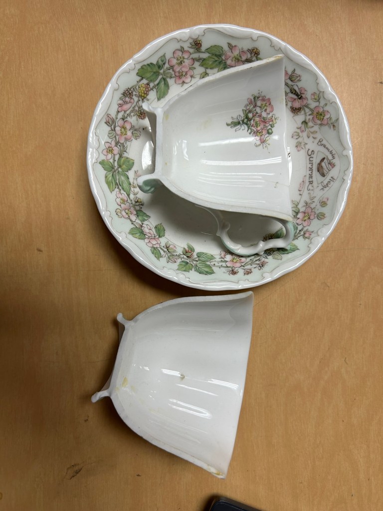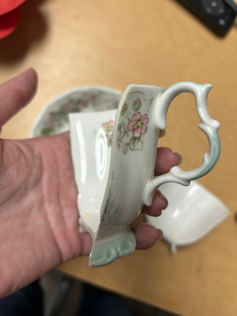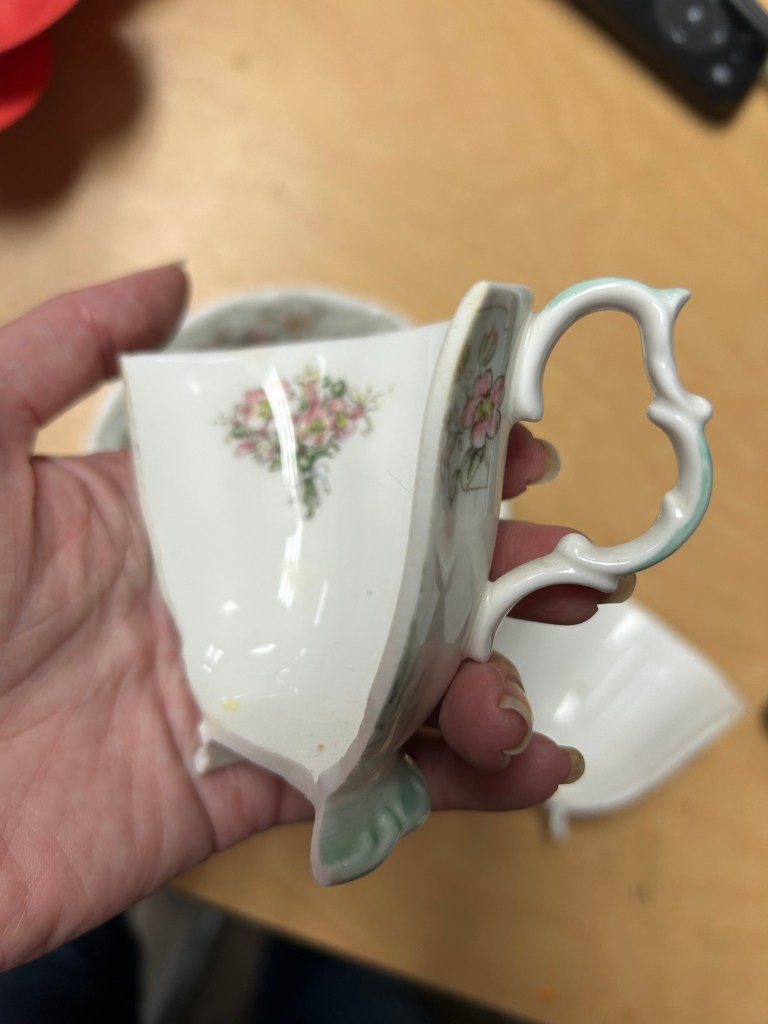 I dropped this cup many years ago when my kids were babies. It split cleanly in two. I glued it back together with superglue and use it for a pretty holder of all the playground flowers my students bring me from recess (yes it still holds water!) on my school desk. I thought it would be cool for you to see the shape of the inside of the cup!