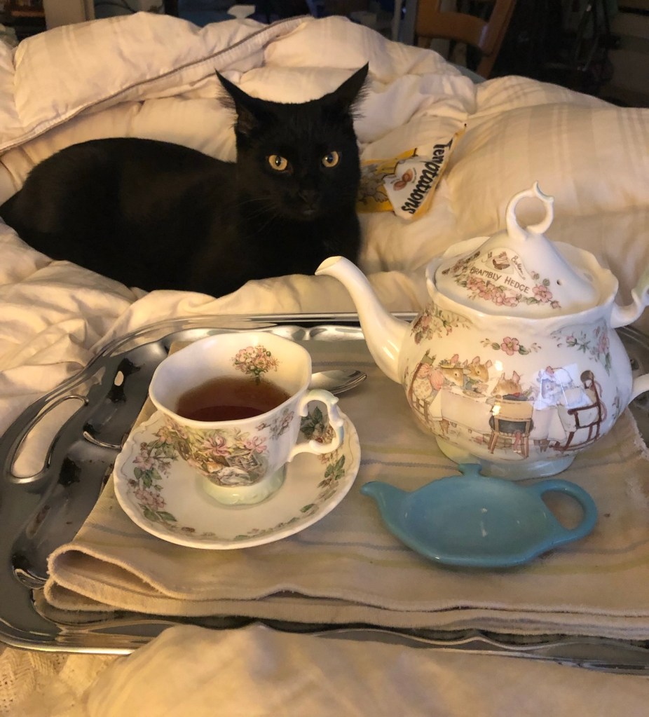 As the tea warms me from the inside my cat warms my feet. Spooky is delightfully cozy! When my sweet golden retriever Abbey was still alive and able she loved to get in bed in between me and my husband in the mornings and snuggle too. Her with her big dog happy sighs! I miss her so much.