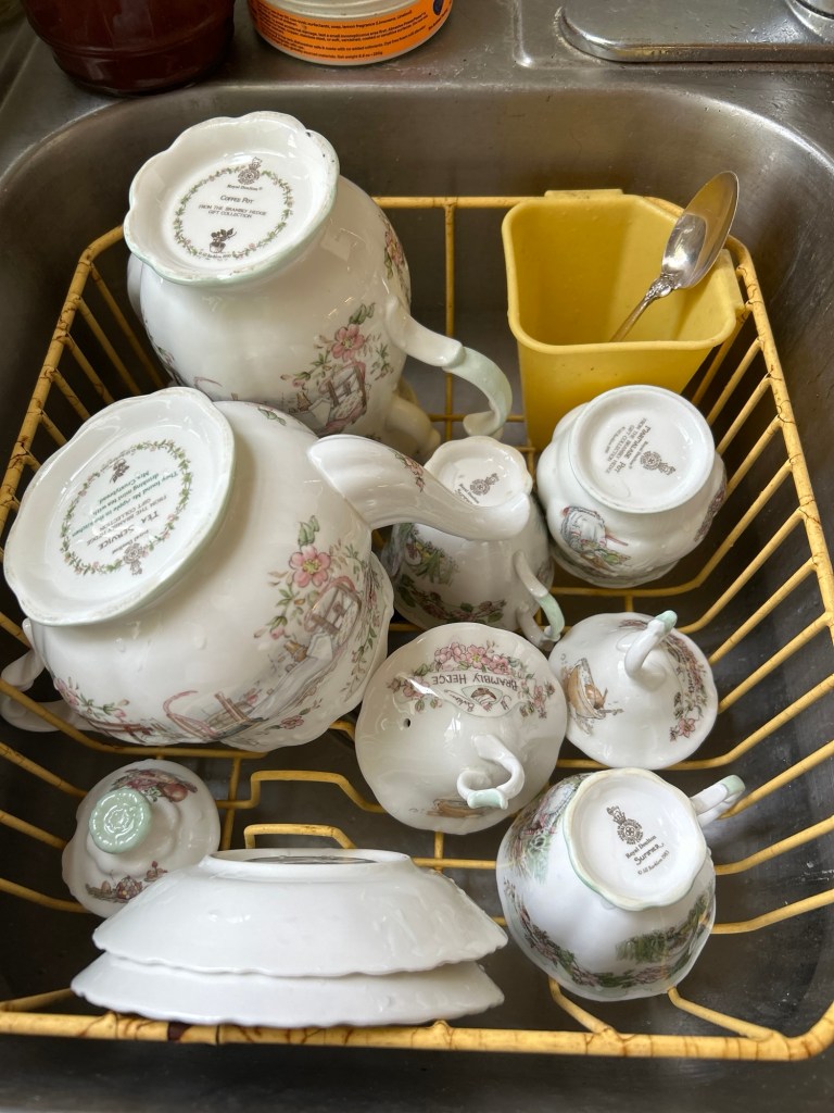 The process to make bone china tea sets is very long. It includes pouring liquid porcelain clay slip into moulds, letting the water evaporate for a day then taking the mould off. Handles and spouts are now placed. The piece then has its seams trimmed and smoothed. Then the piece is bisque fired. After that the first glaze is applied, usually by dipping the piece and sponging off the bottom so the glaze doesn’t stick to the shelf in the kiln. When the glaze is dry it can also be rubbed off the bottom with sandpaper. The piece is fired again at a very high temperature. Lastly, any transfers are slipped carefully on and placed with water, then squeegeed to the piece to press the water out from underneath. Lastly, one final fire to set the transfer! A gold or platinum edge might be added and then the piece is ready for market!