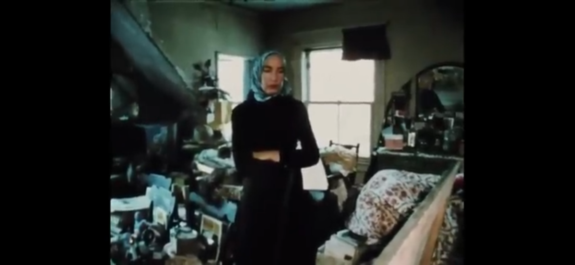 Before the footage was shot for Grey Gardens there was footage made the summer before when Jackie’s sister Lee visited to direct workmen and talk with her cousin and aunt. This is before the house is fixed up. (Yes- the house had been “fixed up” for almost a year when the Maysles filmed Grey Gardens!) There are bags of garbage in the cellar (they apparently couldn’t pay to have the garbage removed), piles of empty cat food cans in the kitchen, mounds of cat and probably human feces on the floor. The stench of urine so heavy your eyes water. Fleas. No heat, no electric, no water. Just cats, rotted furniture, holes in the ceiling, and filth so thick it was dripping down the sides of the stairs in stalactites of disease and decay. The one thing that stands out to me, however, is the grime! Their matresses don’t have sheets and they are almost black with dirt. The doors have layers of grime around the knobs and the wood above where their hands have touched them and closed and opened them for over 50 years. They gleefully sing and dance through all of it!