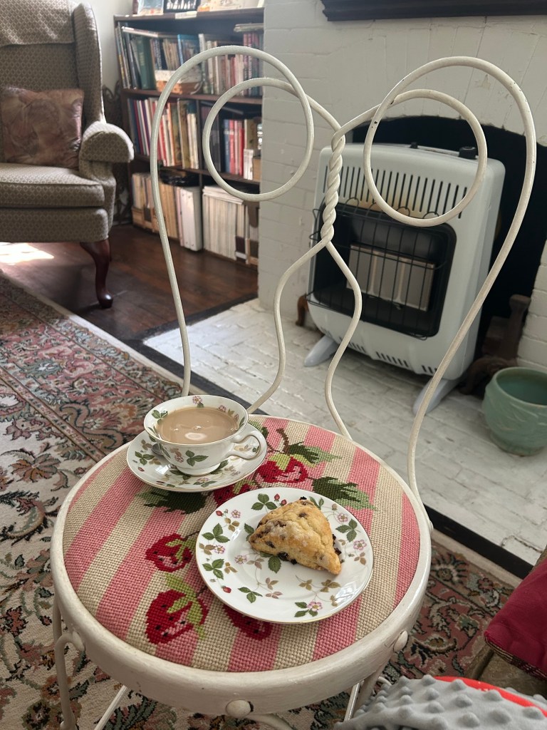 And so, ever since our delightful afternoon tea I have been having my own almost every day. I’ve been baking scones, making Devonshire cream, and having a grand time in the library reading and drawing and having tea at my strawberry ice cream table with my Wedgwood Wild Strawberry china!