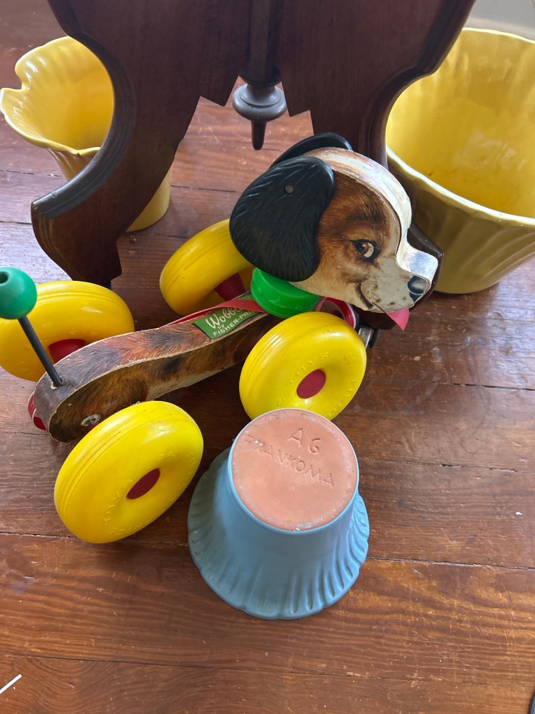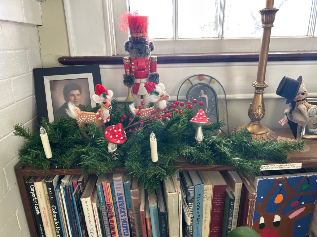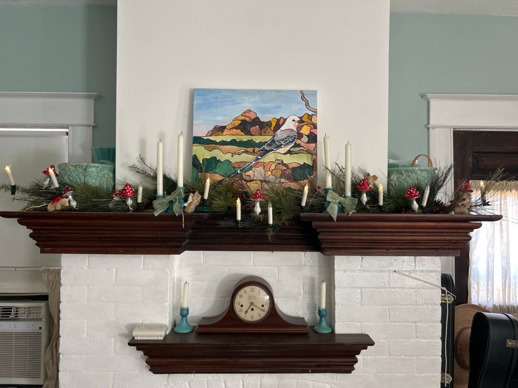 Our room has a fireplace (it doesn’t work anymore) and a mantle. You see what I mean about this house begging to be decorated for Christmas? So a woodland garland joins my beautiful collection of aqua Mccoy, Frankoma, Van Briggle, and Bauer pottery. I put my little Steiff mice in-between the mushrooms and they look adorable!