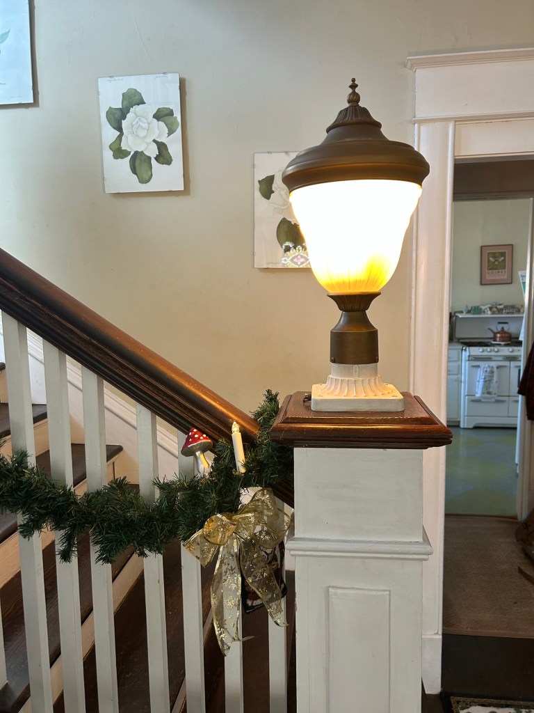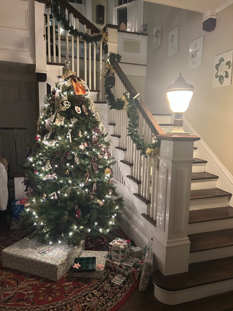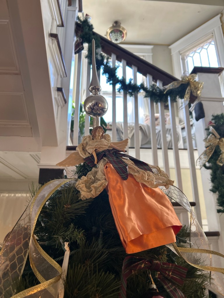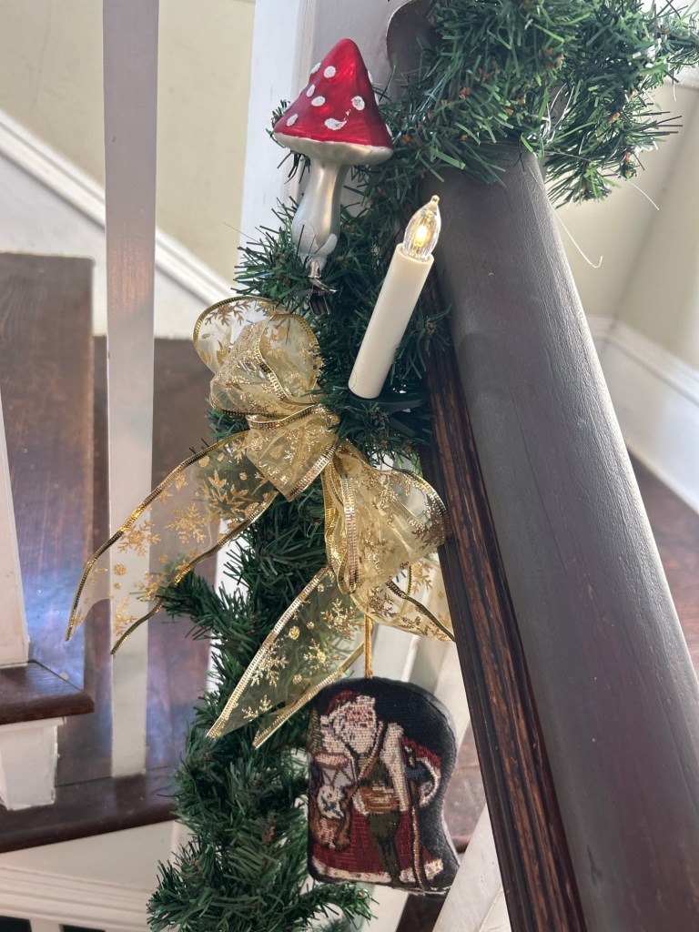 The next day I put the ornaments on the tree and the ribbons, star, angel, santas, etc. Then Josh helps me tie the garland to the stair rails. The garland is also decorated.