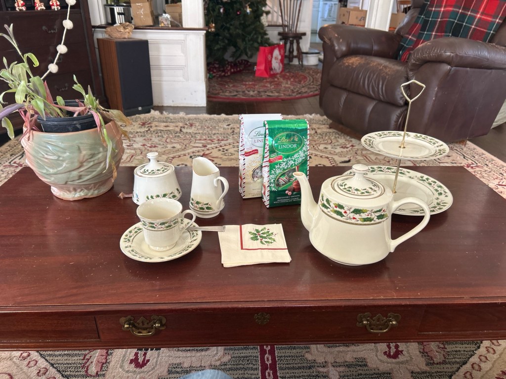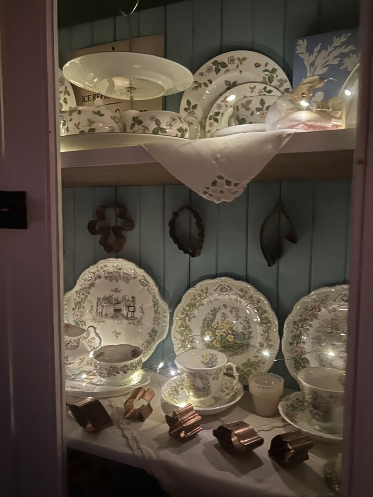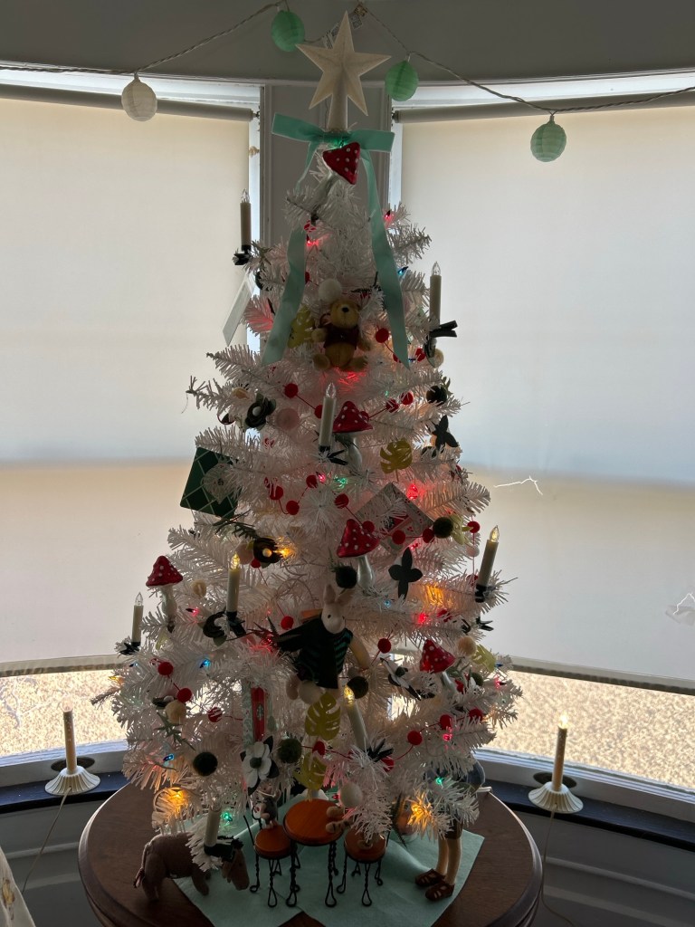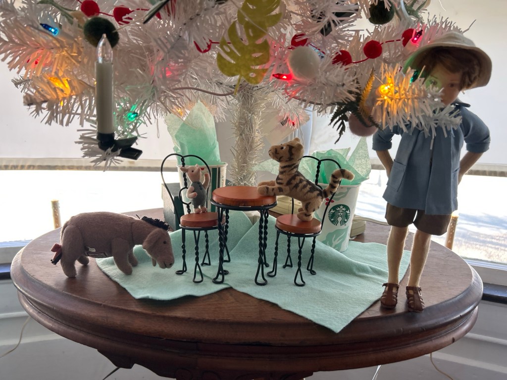 New things and changes this year: I purchased more clip-on glass mushroom ornaments and little clip-on LED candles- these are very popular in Germany and I thought they added the perfect touch of whimsy to our decorations. I didn’t have enough teacups and saucers or dessert plates for my Christmas dish set so I bought 4 more of each. My sweet husband drilled holes in my Christmas dishes as well as my Wedgwood dishes to make plate stands. I also want to use my few John R Wright Pocket Pooh characters to help add more cuteness to Christmas. (I’d been collecting deeply discounted ones on E-Bay this summer.)