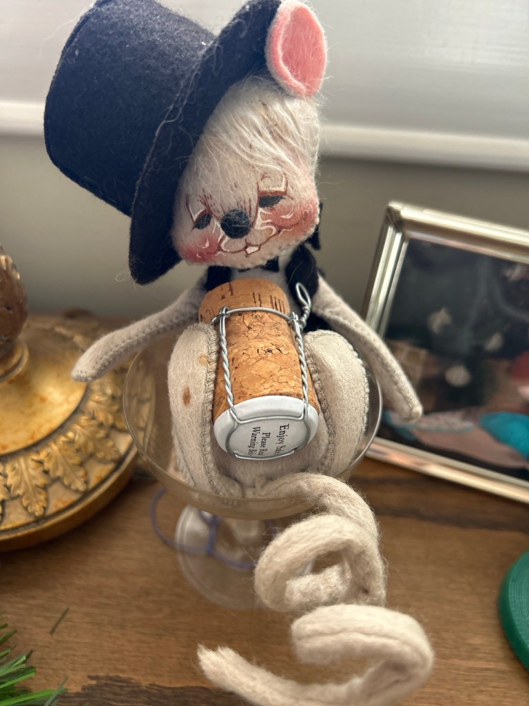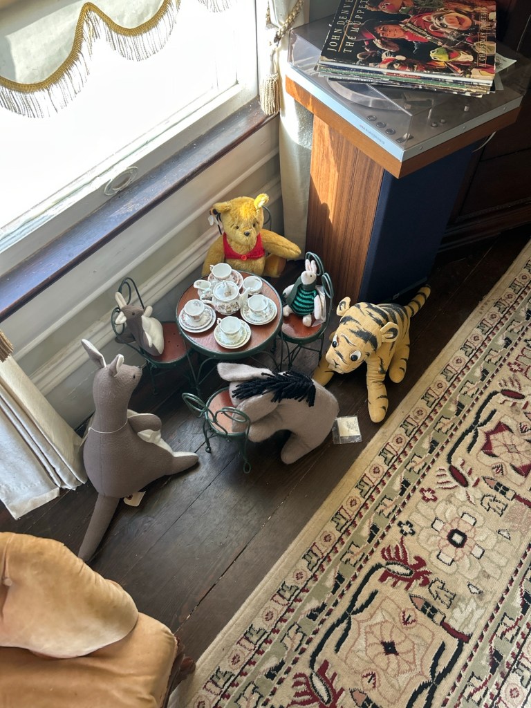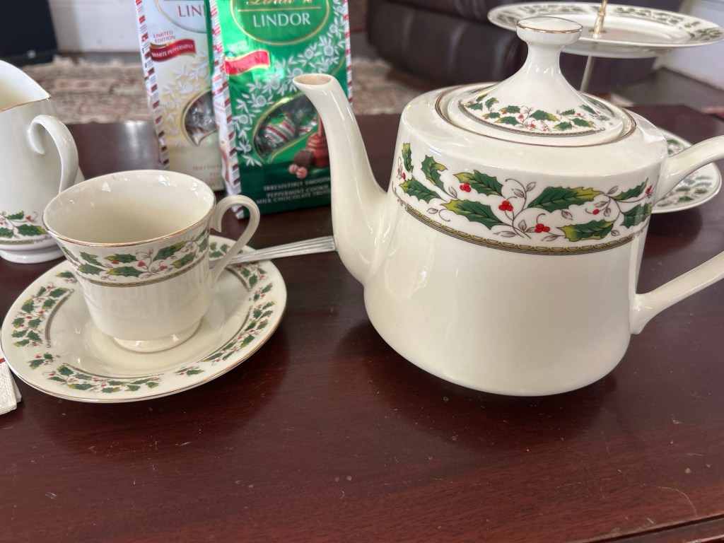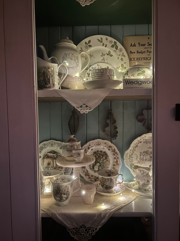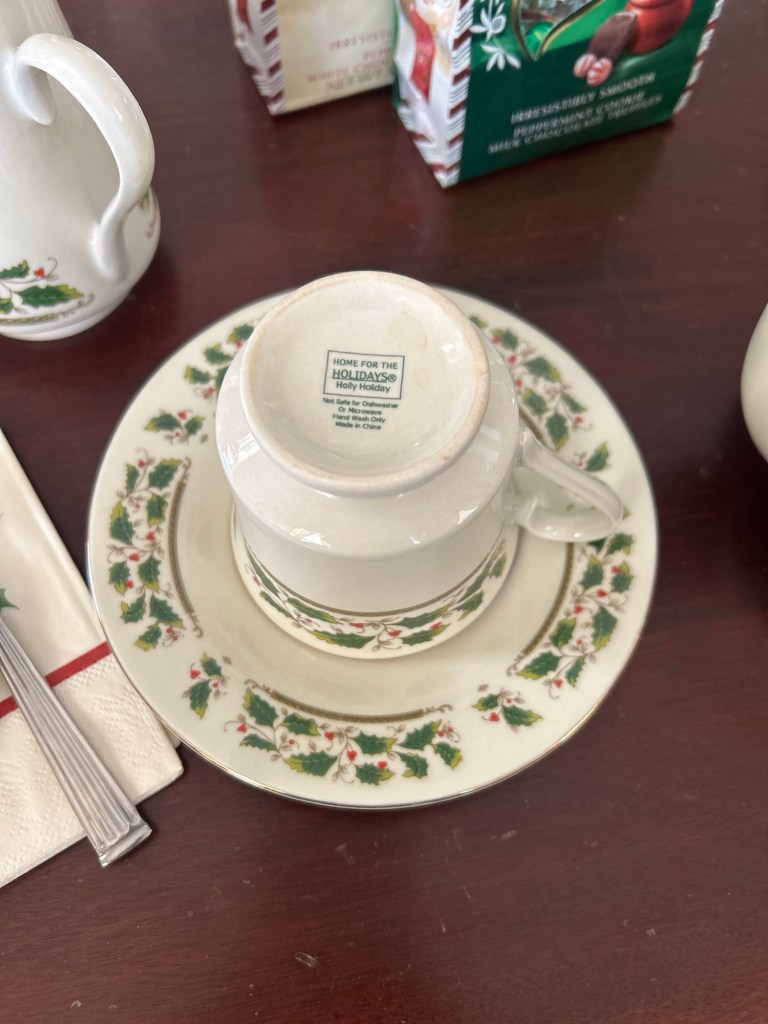 New things and changes this year: I purchased more clip-on glass mushroom ornaments and little clip-on LED candles- these are very popular in Germany and I thought they added the perfect touch of whimsy to our decorations. I didn’t have enough teacups and saucers or dessert plates for my Christmas dish set so I bought 4 more of each. My sweet husband drilled holes in my Christmas dishes as well as my Wedgwood dishes to make plate stands. I also want to use my few John R Wright Pocket Pooh characters to help add more cuteness to Christmas. (I’d been collecting deeply discounted ones on E-Bay this summer.)