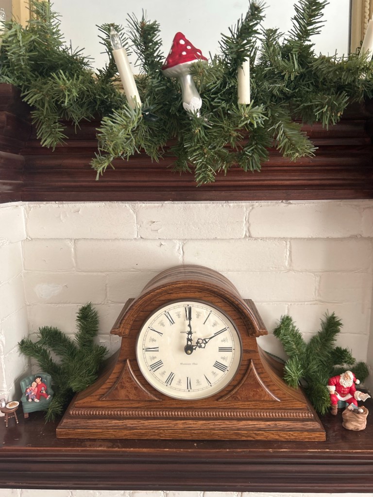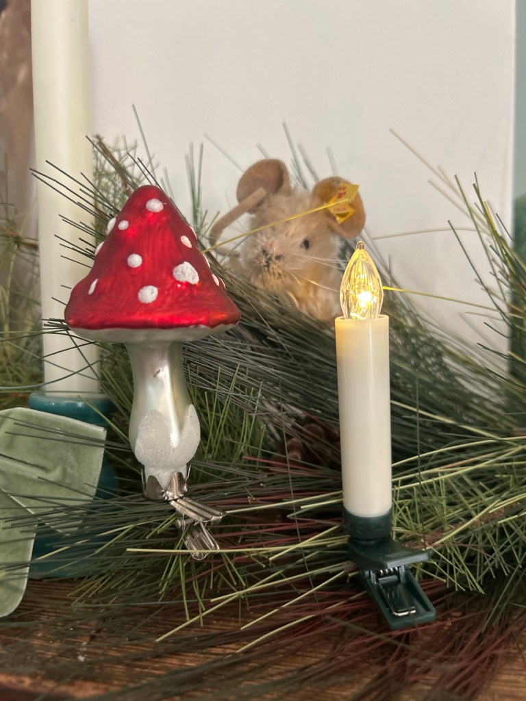 Next is the library and I put LED candles and glass mushrooms in the greenery on the mantle. I have been watching the lovely Youtube channel Kirsten&Jeorg and loving all their German Christmas videos for inspiration!