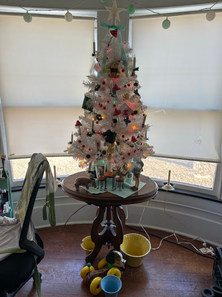 Then the studio woodland/Starbucks/Pooh tree is set up to bring cheer to the shared work space of my husband and I.
