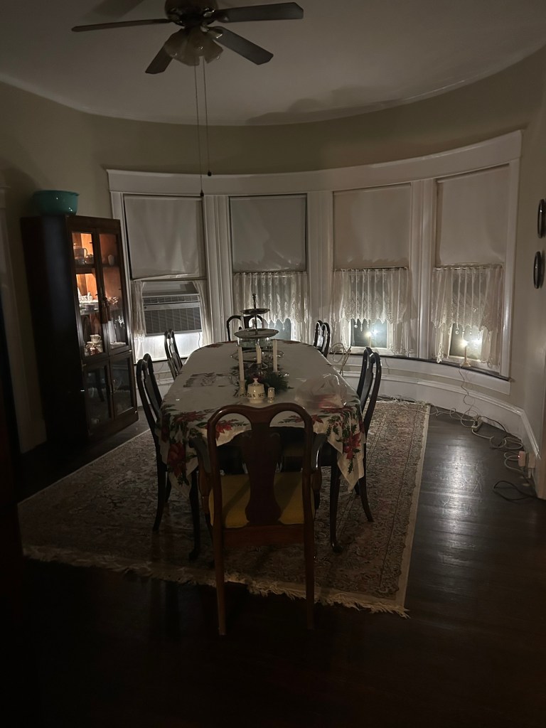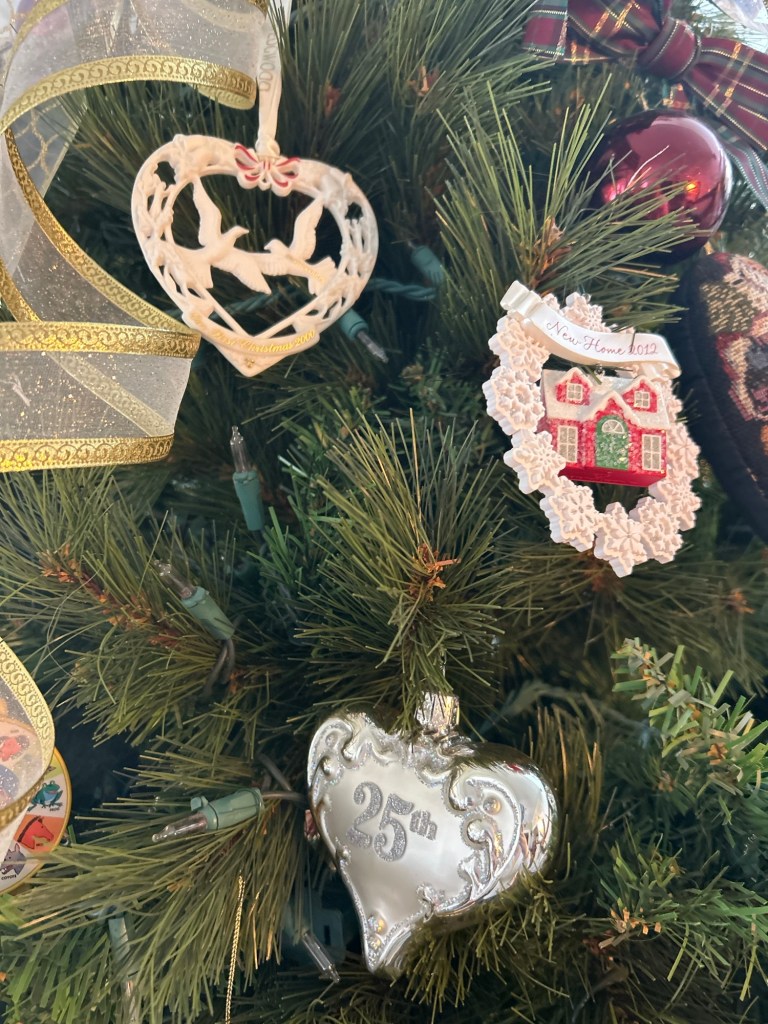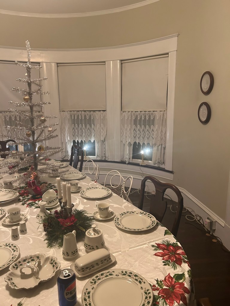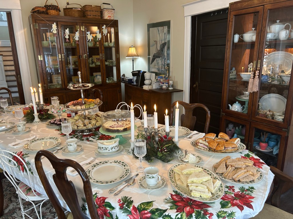 Ya’ll know I have a dish-ease, so of course, I have Christmas dishes. And out they come to sparkle and gleam with the crystal and silver and candle-light. Placed carefully on a vibrant poinsettia tablecloth, they will bring cheer to our special meals for the next six weeks. In the middle of the table is our handsome tinsel tree that I decorated with old Christmas ornaments from the Austrian professor we bought the house from. (They were left in the basement.)