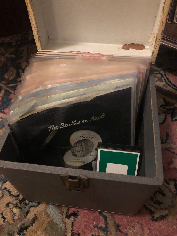 The little carrying case below I bought in an antique store. It was labeled as a sewing box, but I knew what it was- a case for carrying record singles! Can you imagine being a teen girl in the 60s and taking this, filled with your favorite singles to a slumber party! We had a classic 1966 Pontiac Bonneville for a very long time and you could get a record player for it! You could listen to your favorite records while parked on lover’s lane and while waiting for the movie to start at the drive-in!