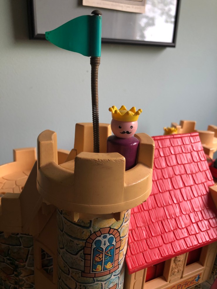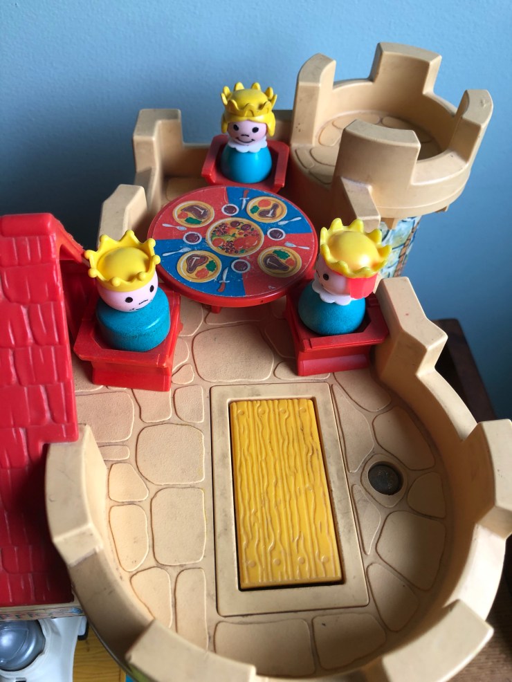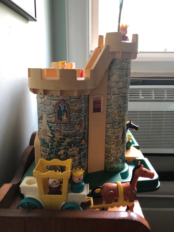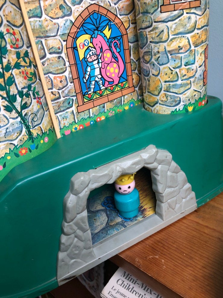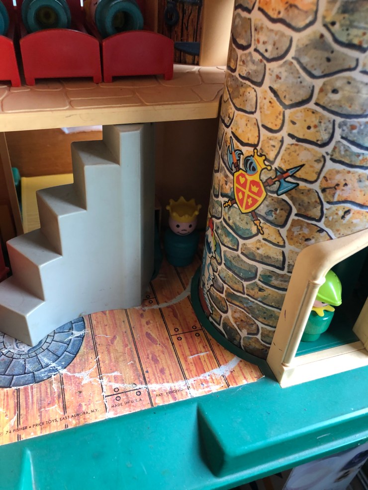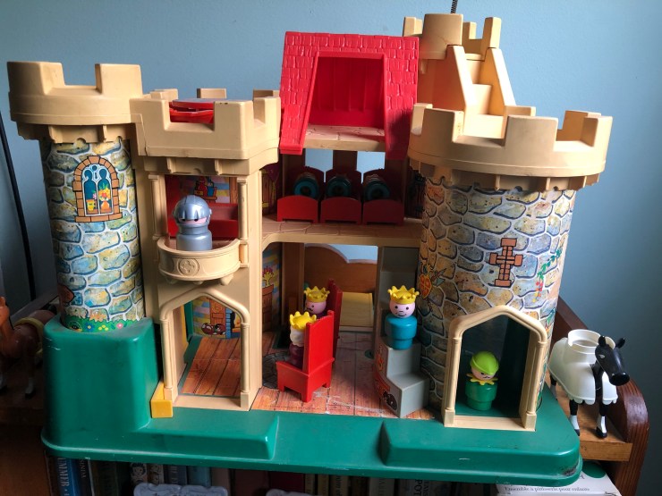 Now that I’ve shown you our individual playsets, here is how I store them: on shelves in the day nursery room on the top floor of our 114 year-old house. They used to be in my children’s rooms, and when they did not want baby toys in their rooms anymore I had a hard time with that part of their growing-up, but thankfully we have a place for these precious toys. I still find my kids up here sometimes, playing and reminiscing. It is so pleasant to remember their little voices talking to themselves and doing the voices for the Little People. The castle is in my studio as it is my favorite.