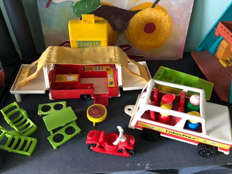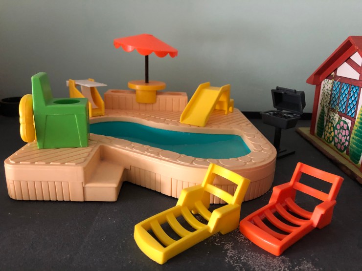 Then the classic 80’s house, #952, with accessories I’ve added over the years. My favorite things about this playset are the dog paw prints behind the garage and the working doorbell. The toilet was always pretty funny too.