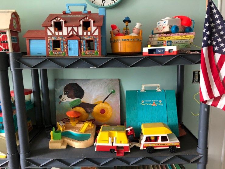 Here are some extra fun things! A shampoo bottle with featuring the Little People and three renditions of the dog from the Play Family: #659 Puzzle Puppy, the same dog from a line made for babies, and the original wood dog.