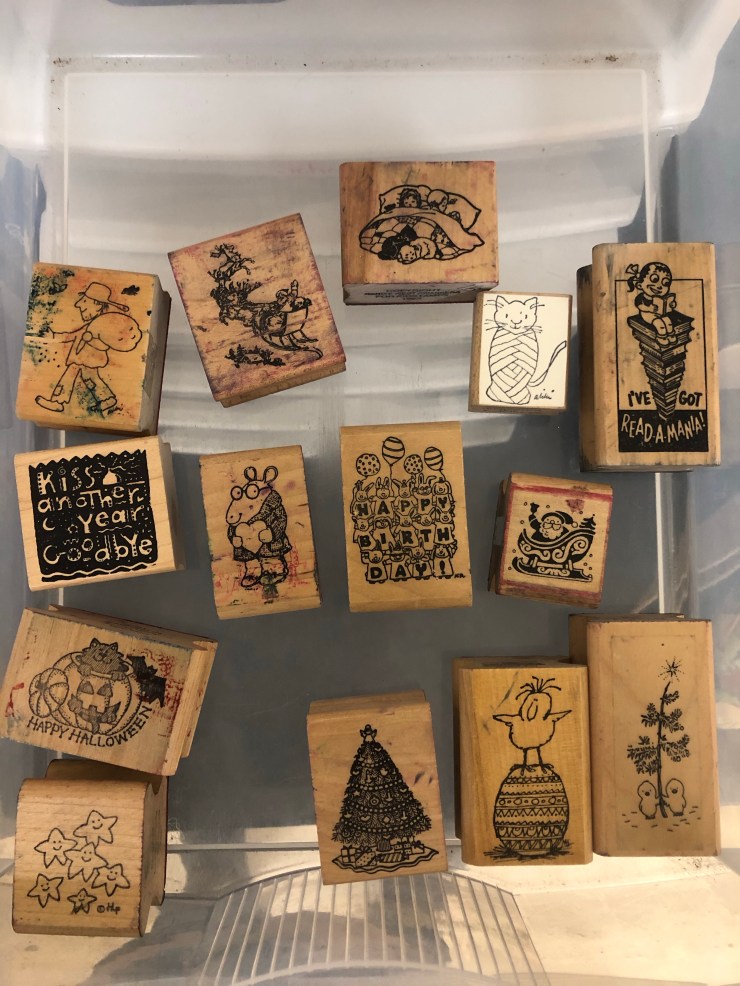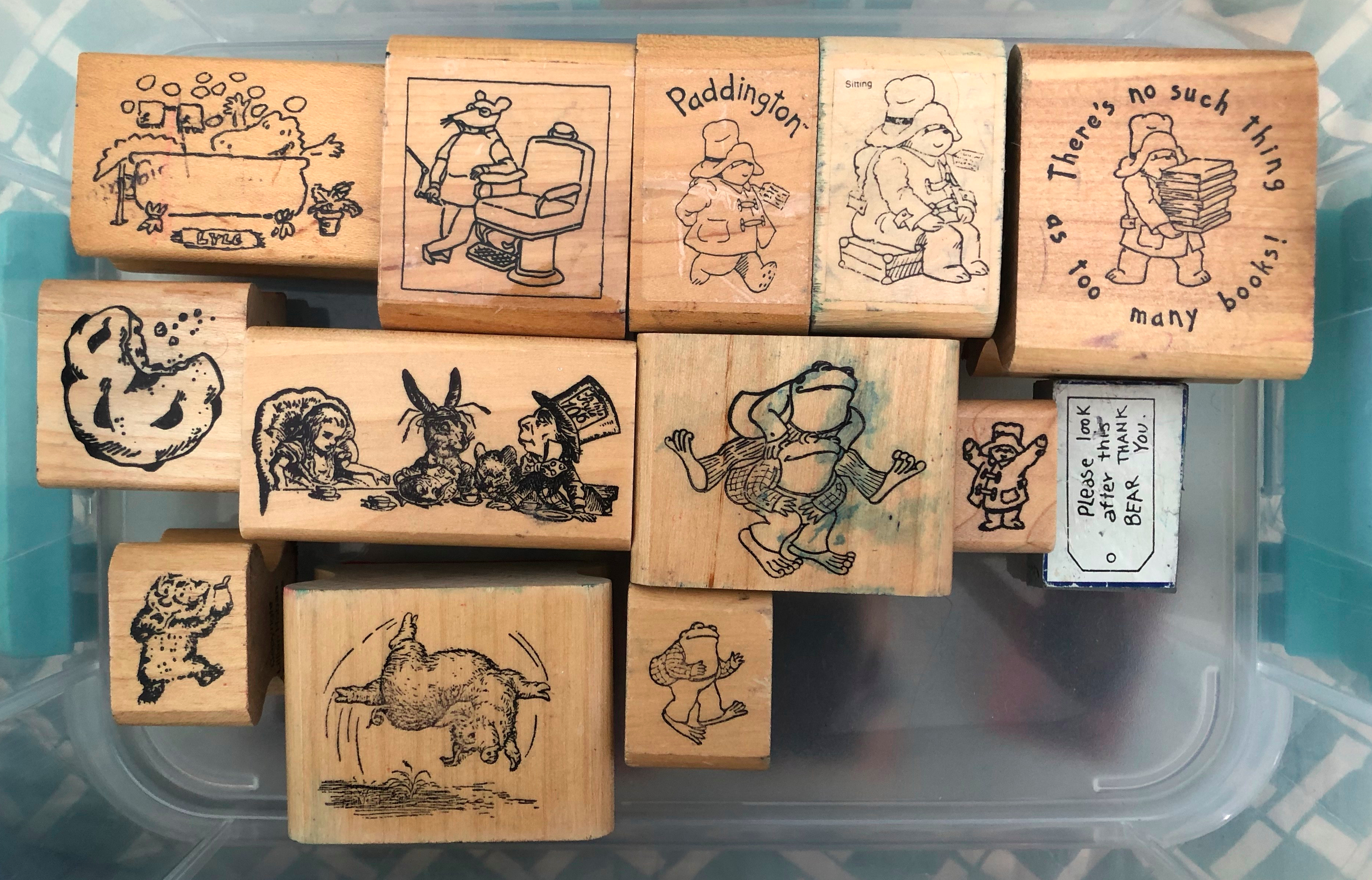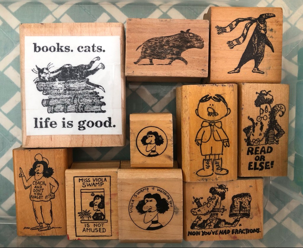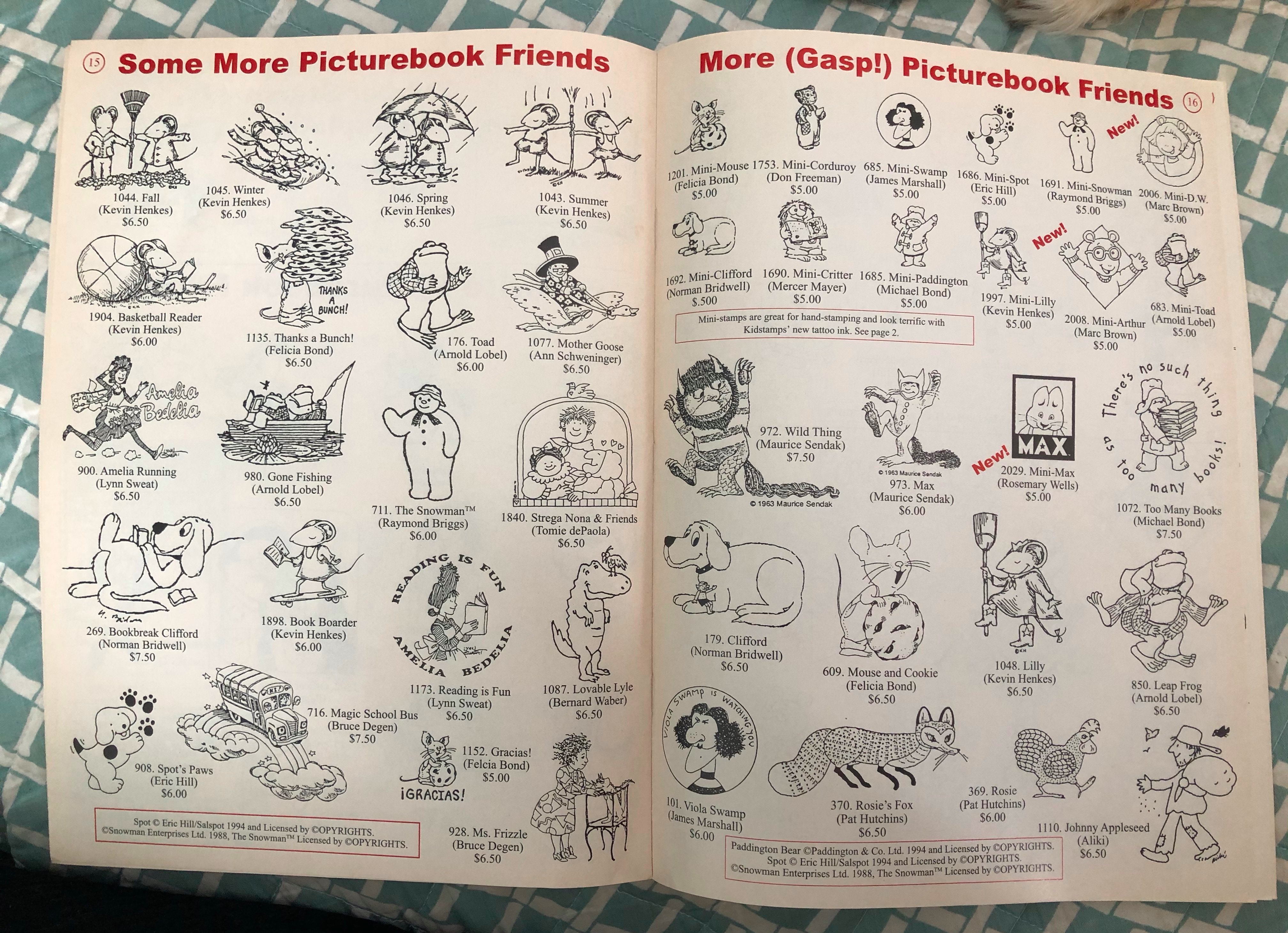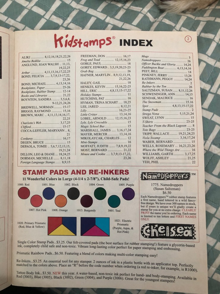 Hello! One of the things I love to do in my classrooms is use stamps! I’ve been collecting them for over 10 years. It all started when I just wanted a Paddington stamp for my first-graders. I couldn’t find one for many years, but came to adore the company that produced it- Kidstamps! Here is my collection! First, a peek inside a catalogue.