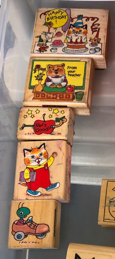 Since all of these stamps are discontinued you can find them on E-Bay as they get listed. When I started ten years ago there were very few listings, now there are tons! Unfortunately, prices have gone up. But they are still worth it and make my students so happy! I use “smelly-good” stamps pads to give them even more of a treat. Happy collecting!